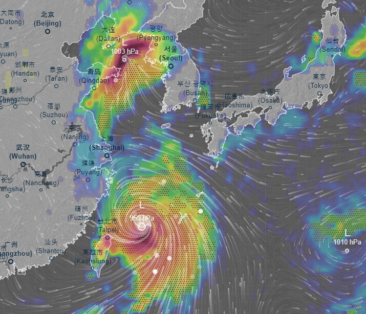 태풍의 모습이 만만치 않습니다. 여기서 북동쪽으로 바로 경로를 꺽어서 갔어야 하는데, 기압배치가 그렇지 않은 부분이 많이 아쉬운 상황입니다.