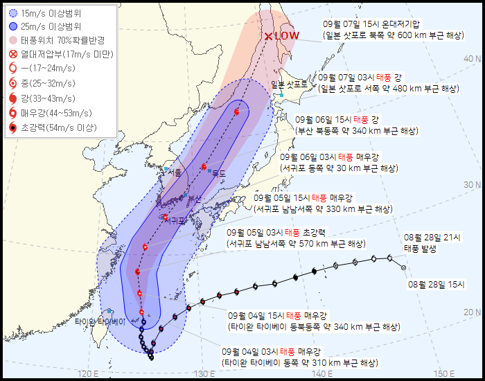 일본 기상청 태풍 경로 예상은 우리나라 부산쪽으로 거의 상륙후 지나가는 경로를 보여주고 있습니다. 태풍의 위험 반경은 동쪽인데, 동쪽은 해상이니 일본으로서는 다행이라고 생각하겠네요.