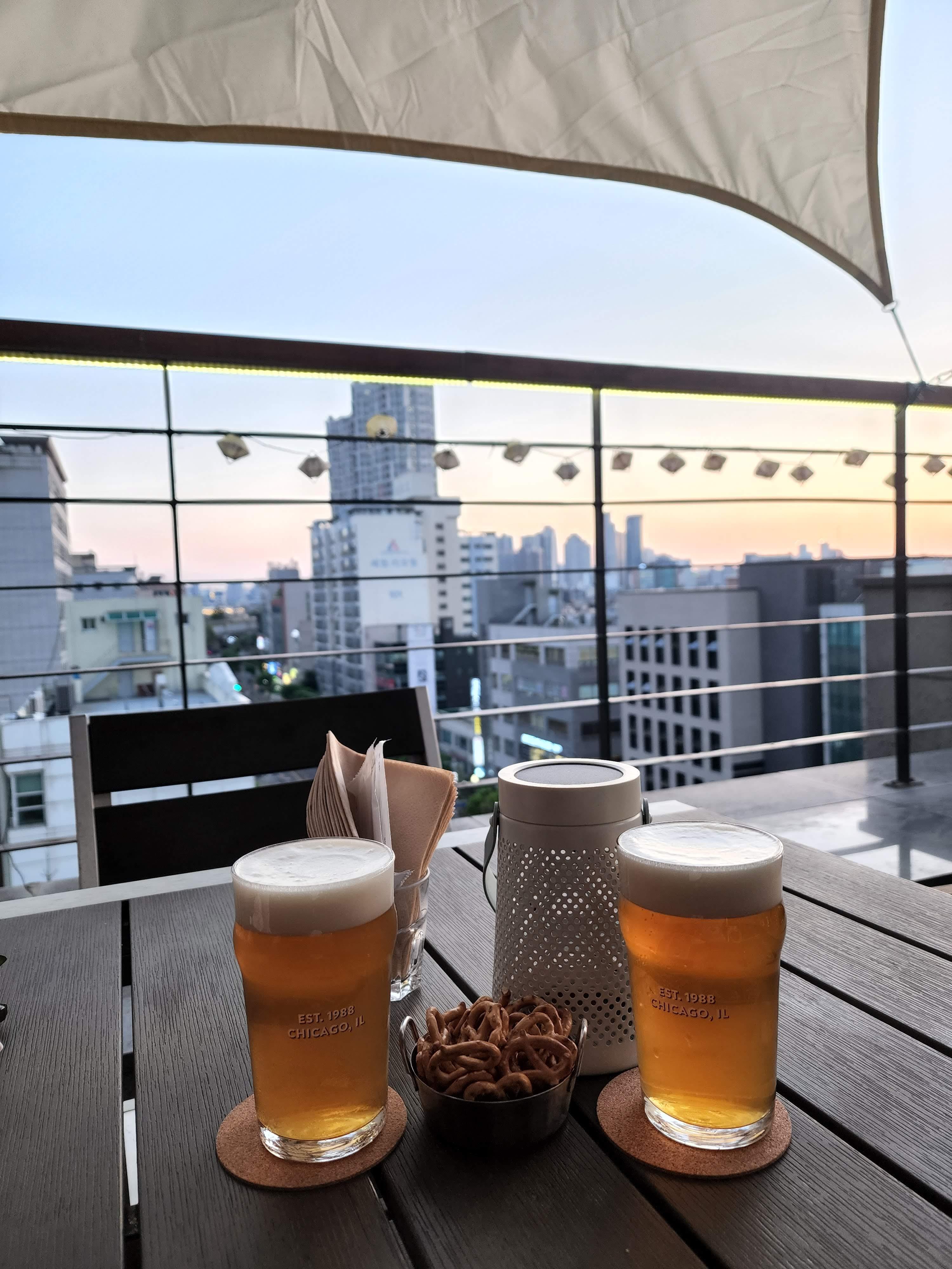 주문한 맥주가 나와서 멋진 배경을 뒤로 사진도 한 번 찍어 봤습니다. 따로 안주 안시키고 맥주만 주문해도 괜찮은 곳입니다.