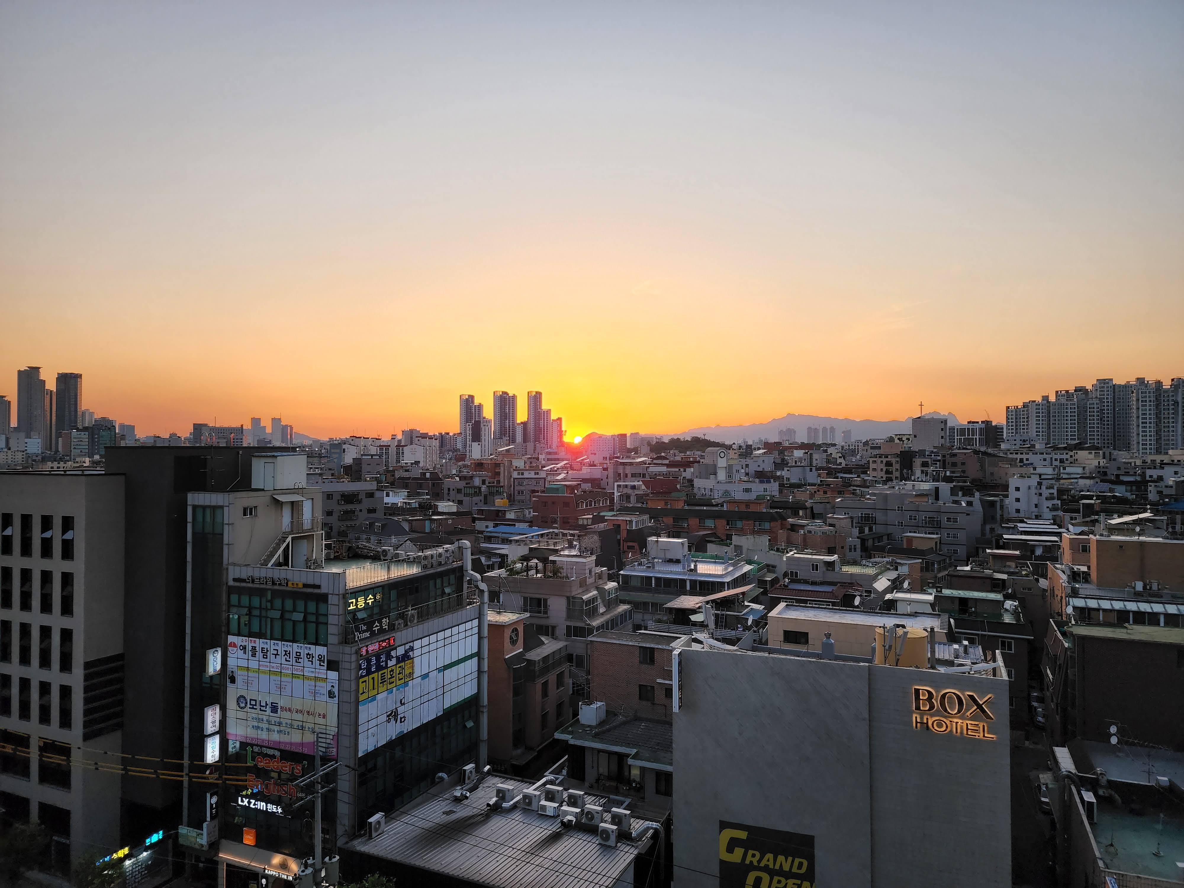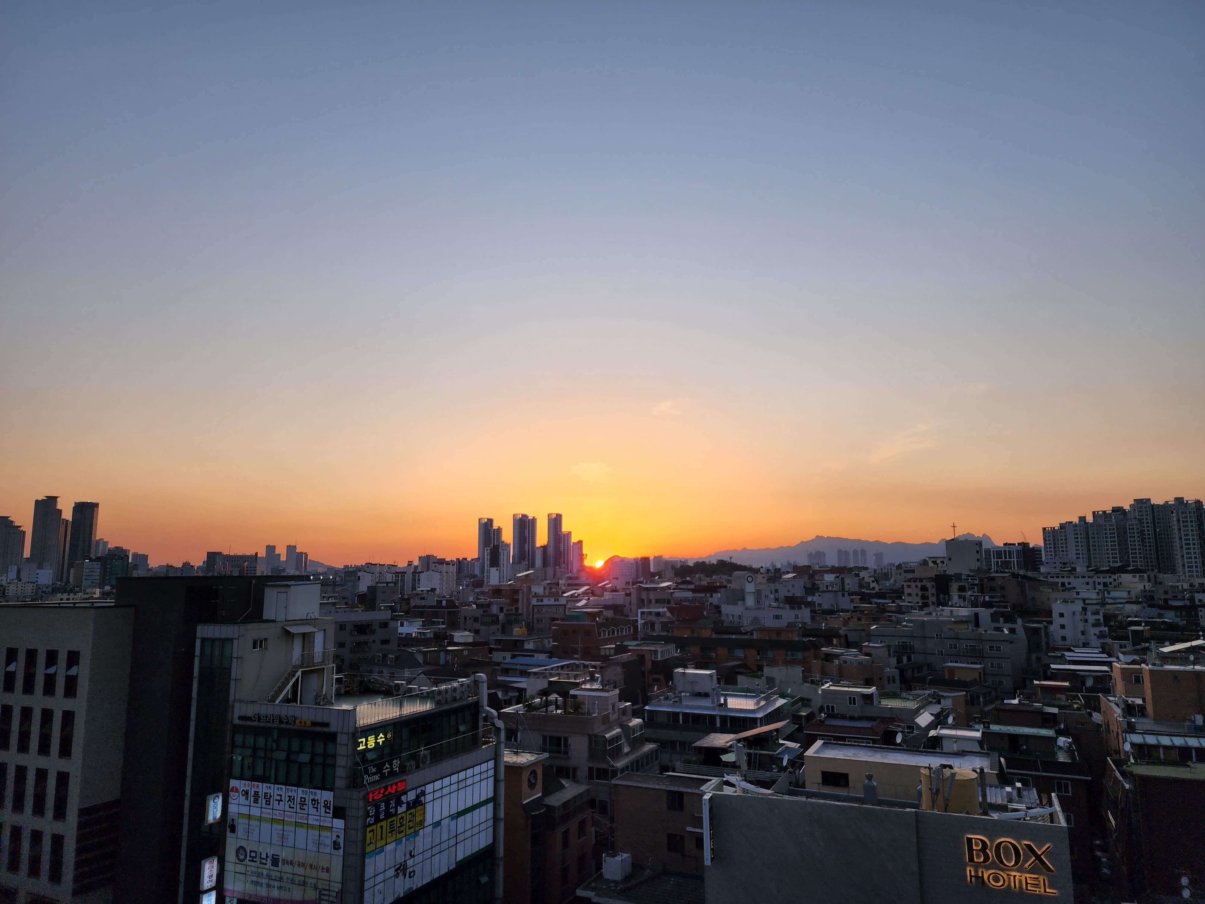 조금 더 넘어간 해입니다. 어둑어둑해지면 멀리 보지 않고 가까운데를 보면 시내뷰를 볼 수도 있습니다. 물론 아주 큰 도로변에 있지는 않아서 자동차들의 빛 궤적이 충분히 보이지는 않지만요.